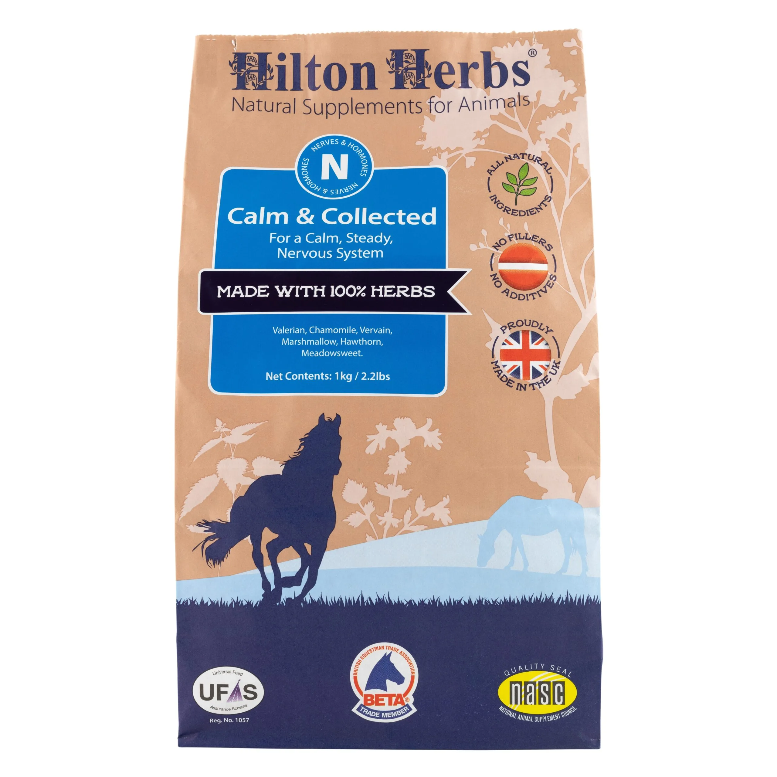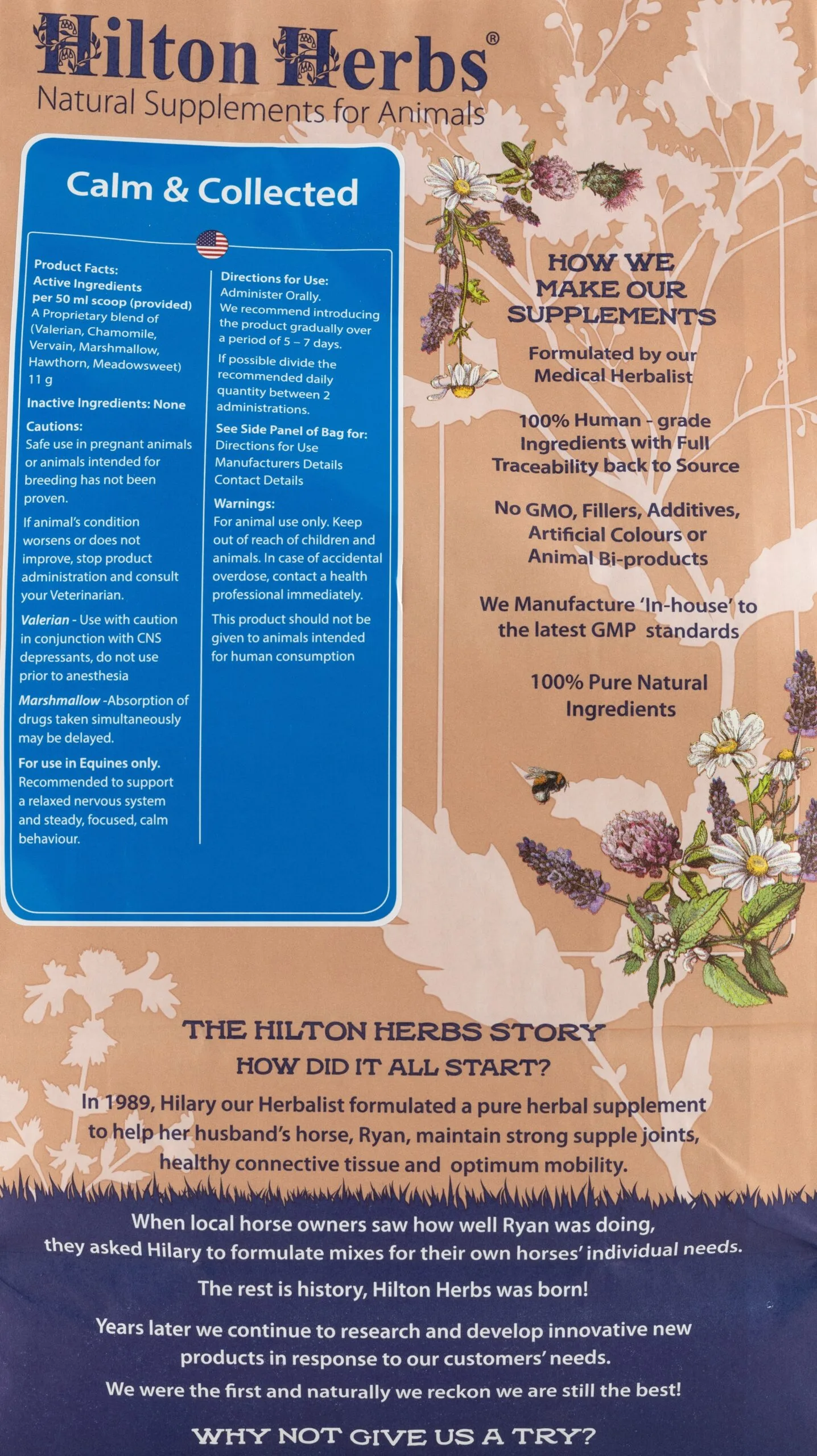Calm & Collected by Hilton Herbs is a natural calming supplement for horses and ponies. This supplement contains a pure dried herbal blend of valerian, vervain, chamomile, hawthorn, marshmallow, and meadowsweet. Calm & Collected is designed for the nutritional maintenance and support of a healthy nervous system.