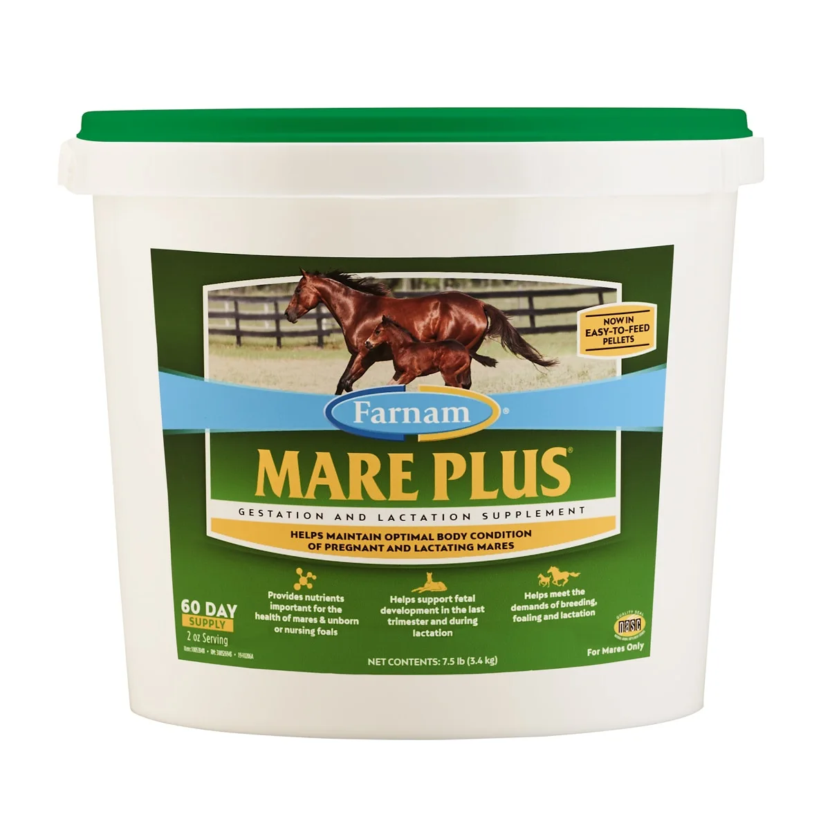 Mare Plus Gestation & Lactation is a new and improved pelleted formula designed to help maintain optimal body condition in pregnant and lactating mares. It provides nutrients important for the health of mares and their unborn or nursing foals to support fetal development in the last trimester and during lactation. The formula offers a balanced calcium to phosphorus ratio, plus added protein, amino acids, folic acid, and vitamin E to replace the nutrients in the mare’S diet that she is providing to her unborn foal.