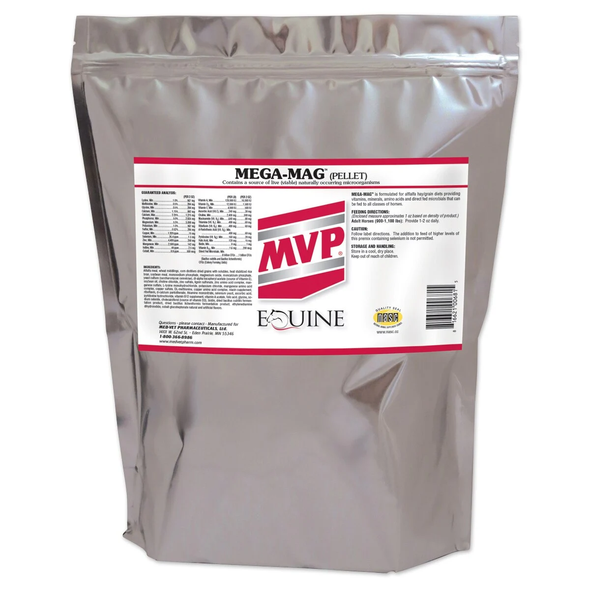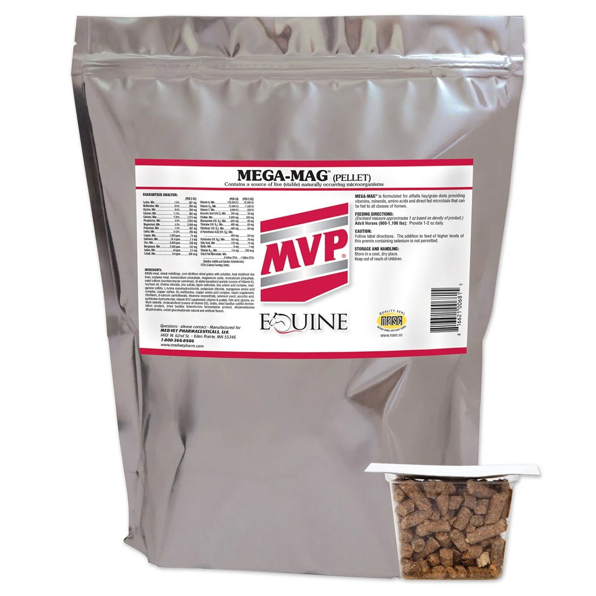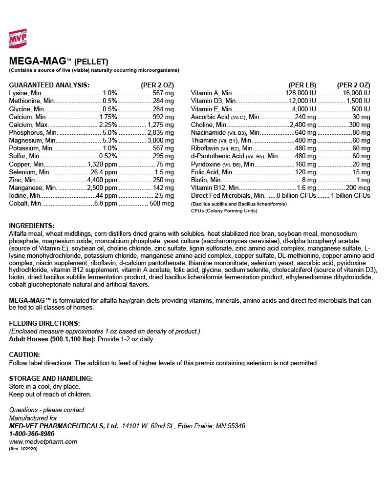 Mega-Magâ„¢ (Pellet) is a well-balanced multi-vitamin and mineral supplement formulated to coincide with current NRC (National Research Council) recommended daily requirements, to accommodate feeding programs consisting of alfalfa hay/grain based diets. The addition of live, stabilized direct-fed microbials, live cell yeast culture, and amino-acid content, sourced from alfalfa meal, rice bran, and soybean meal makes Mega-Magâ„¢ an excellent choice to support growth, stamina, conditioning and maximum performance for all disciplines.
