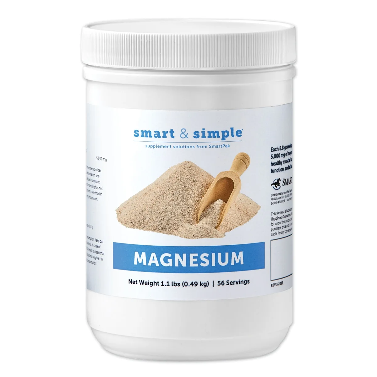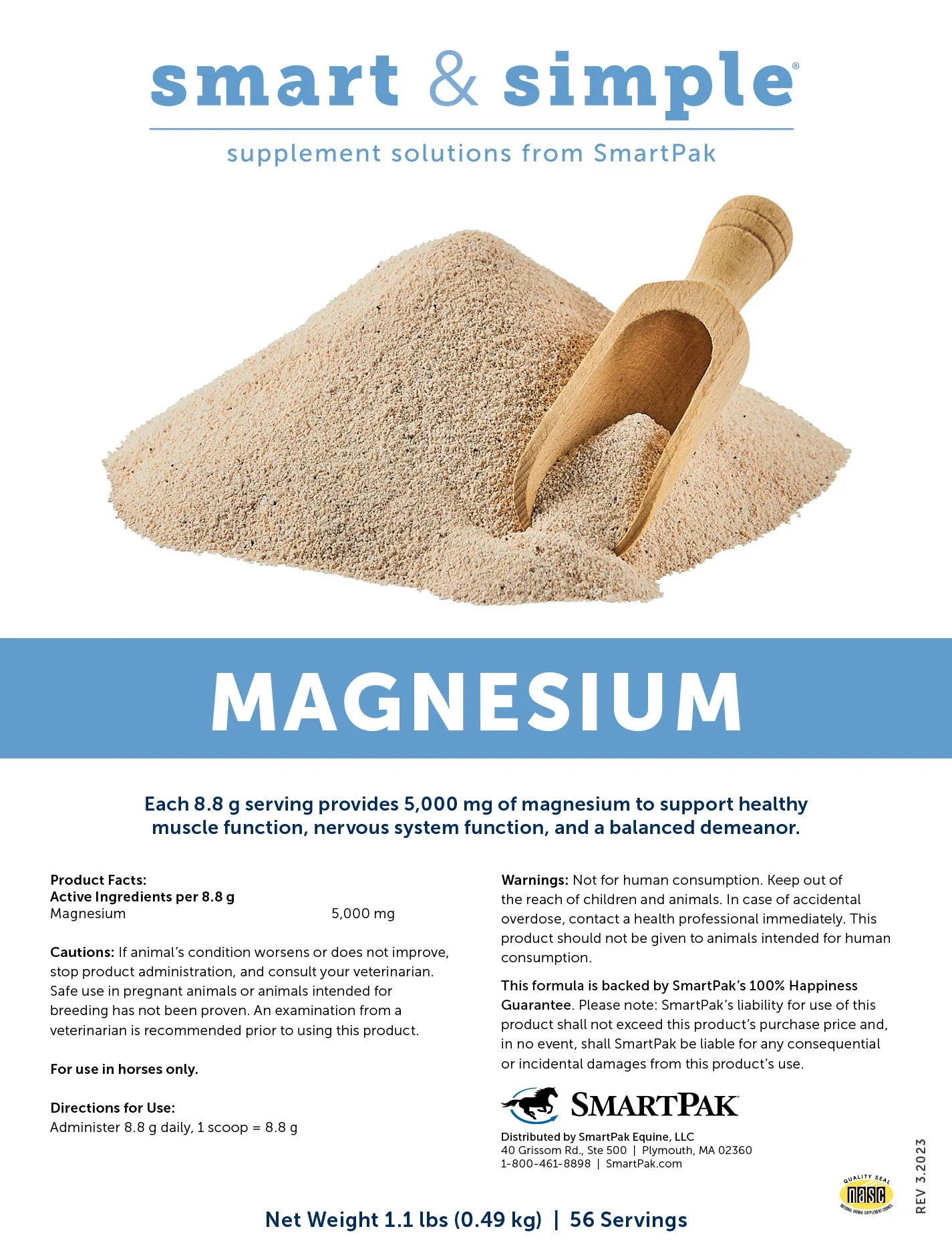 Smart & Simple Magnesium provides 5,000 mg of magnesium, a macromineral that plays key roles in muscle contraction, nerve signaling, and metabolic function. A common area of deficiency in horses, insufficient magnesium may lead to signs of nervousness, excitement, or muscle tremors. Supplementing magnesium supports healthy muscles, normal glucose metabolism and insulin sensitivity, as well as proper nervous system function to help promote relaxation and a calm demeanor.