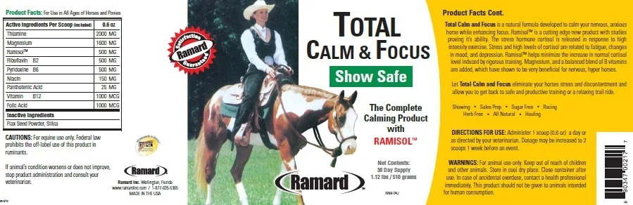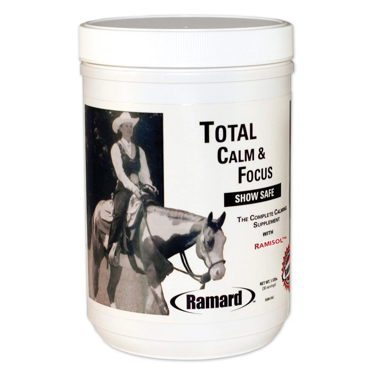 Total Calm & Focus is an all-natural formula designed to help calm nervous, anxious horses and to help them focus. This formula contains Ramisolâ„¢ to help minimize the increase in cortisol levels induced by stress. Stress and high levels of cortisol are related to fatigue and mood changes. Total Calm & Focus also provides 1,600 mg of magnesium, 2,000 mg of vitamin B1, and a balanced blend of other B vitamins.
